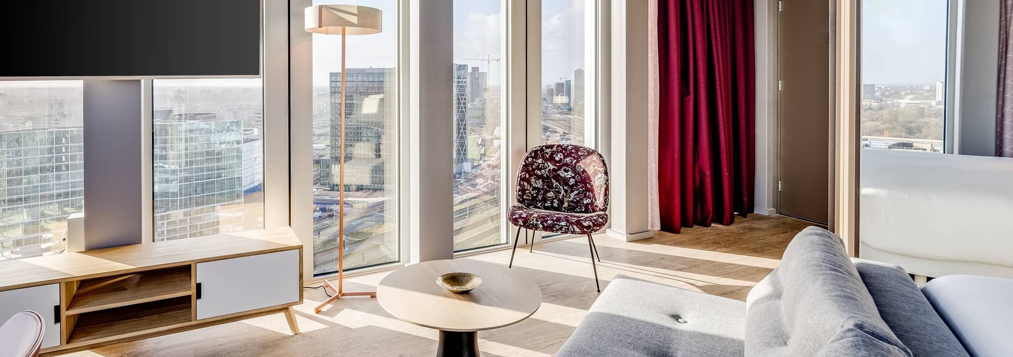 Suba o nível da sua estadia nos nossos quartos nhow premium com vista. Situados nos pisos mais altos, proporcionam vistas extraordinárias de Amesterdão. De 27,5 a 32 m², não falta o espaço para descontrair-se e aproveitar a luz natural, graças às janelas de cima a baixo. Quer opte por camas twin ou Queen, o quarto foi pensado para garantir-lhe o refúgio perfeito. Poderá repor energias, relaxar ou admirar a cidade bem lá de cima.